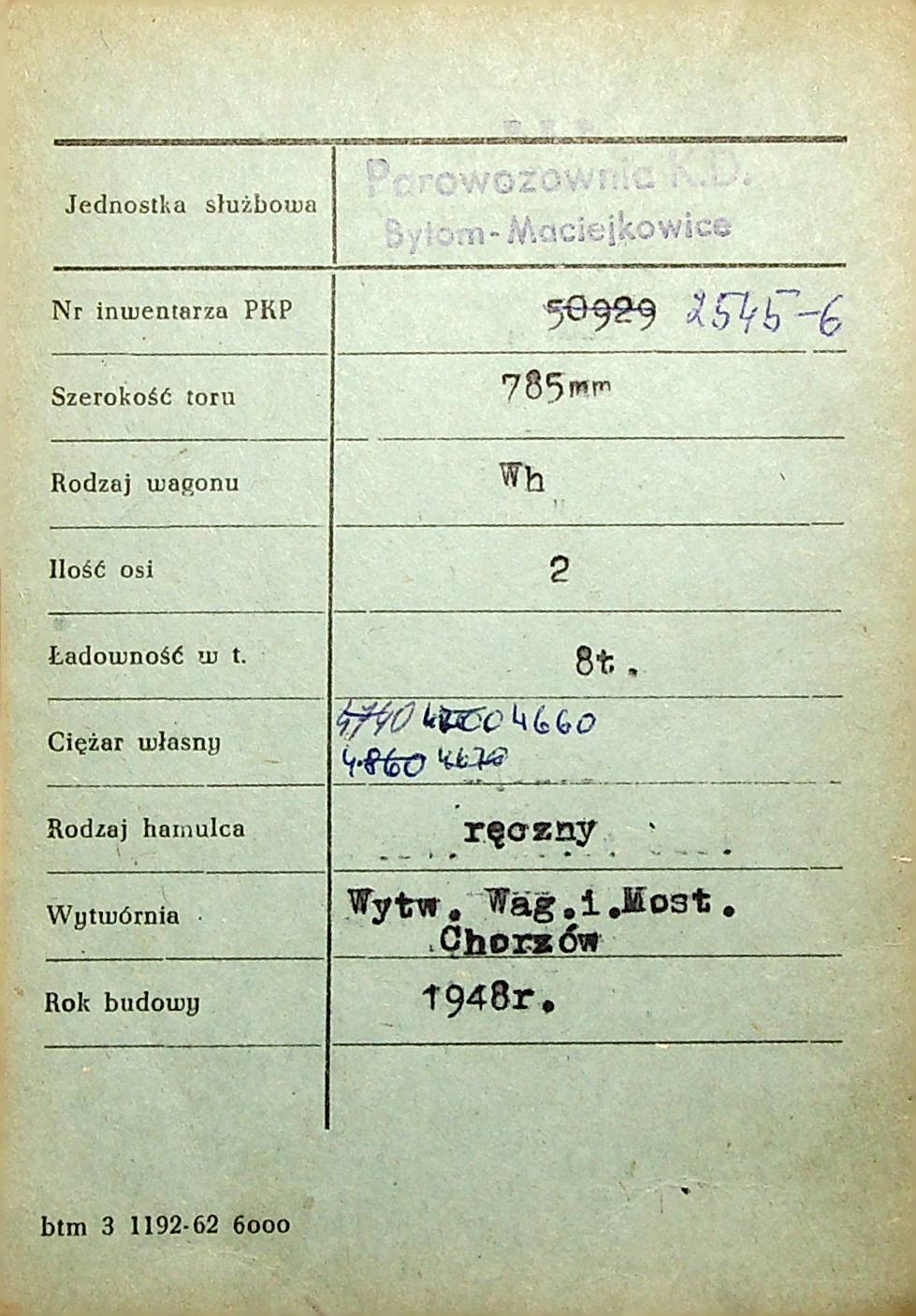 Karta wagonu Górnośląskich Kolei Wąskotorowych |
