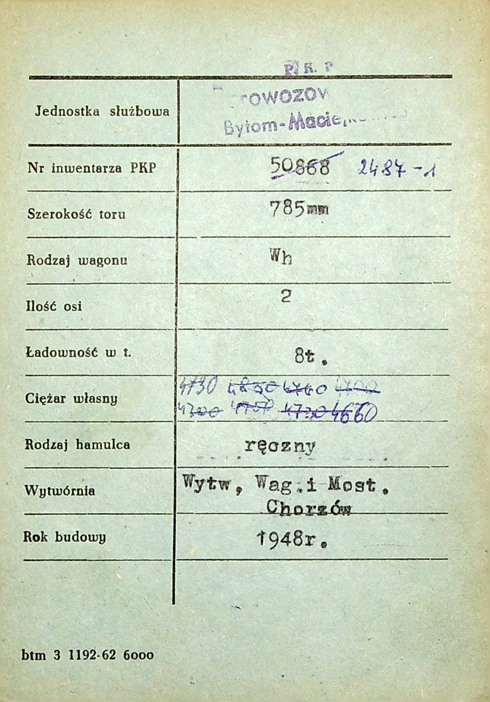 Karta wagonu Górnośląskich Kolei Wąskotorowych |