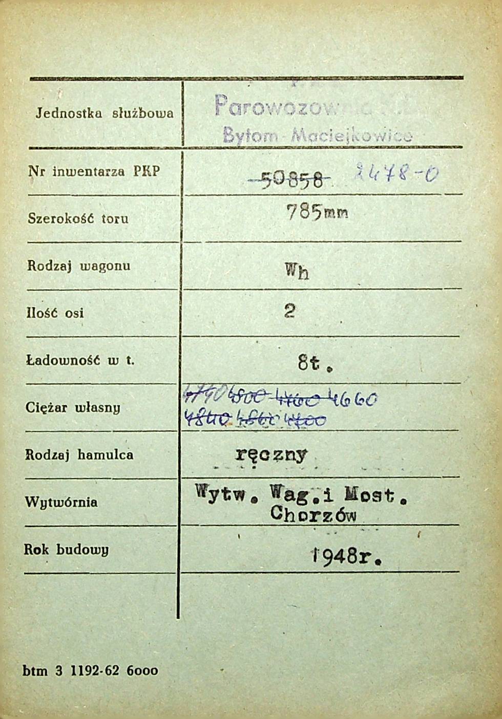 Karta wagonu Górnośląskich Kolei Wąskotorowych |
