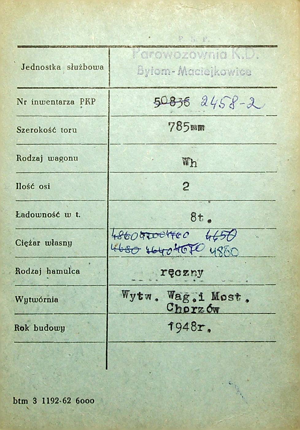 Karta wagonu Górnośląskich Kolei Wąskotorowych |