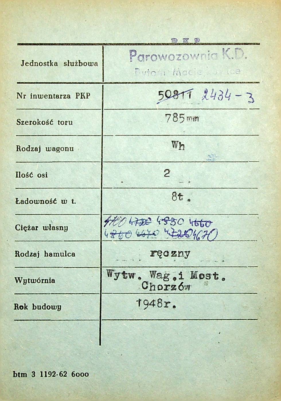 Karta wagonu Górnośląskich Kolei Wąskotorowych |