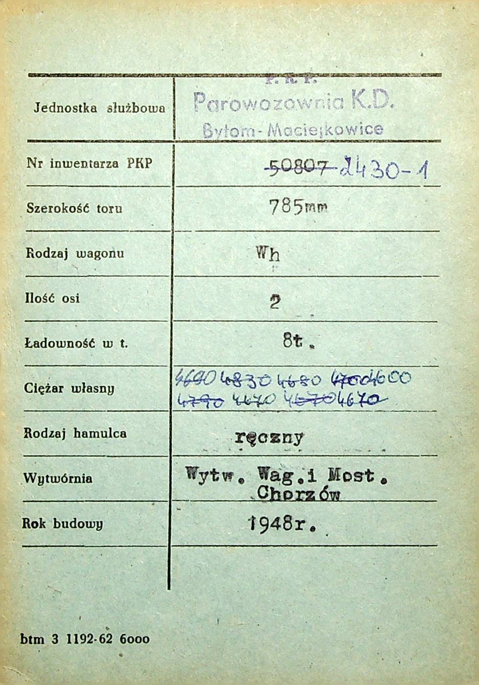 Karta wagonu Górnośląskich Kolei Wąskotorowych |