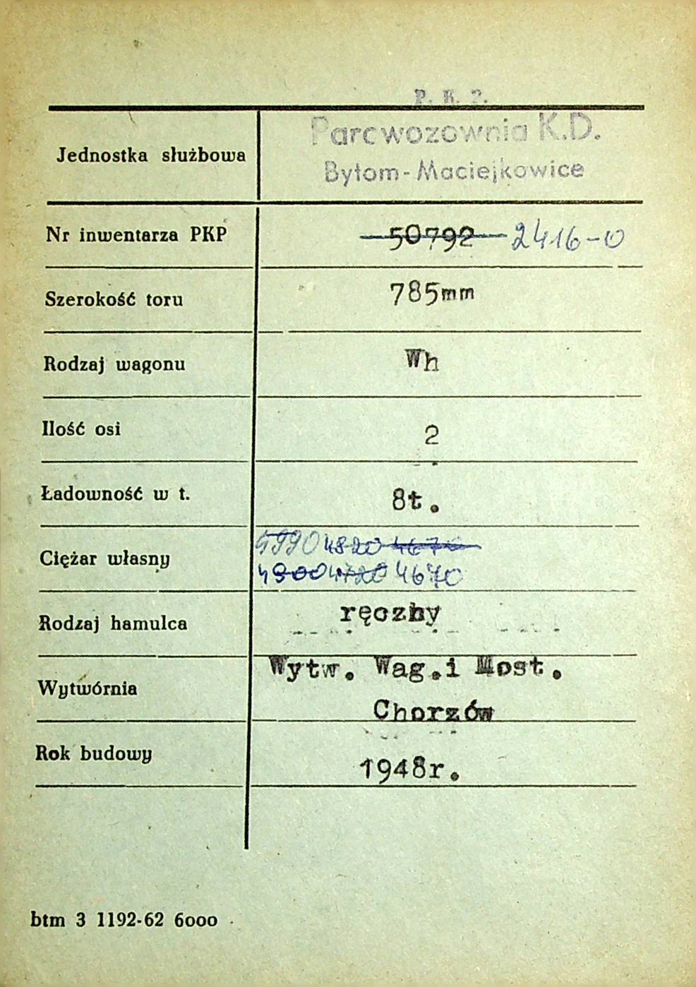 Karta wagonu Górnośląskich Kolei Wąskotorowych |