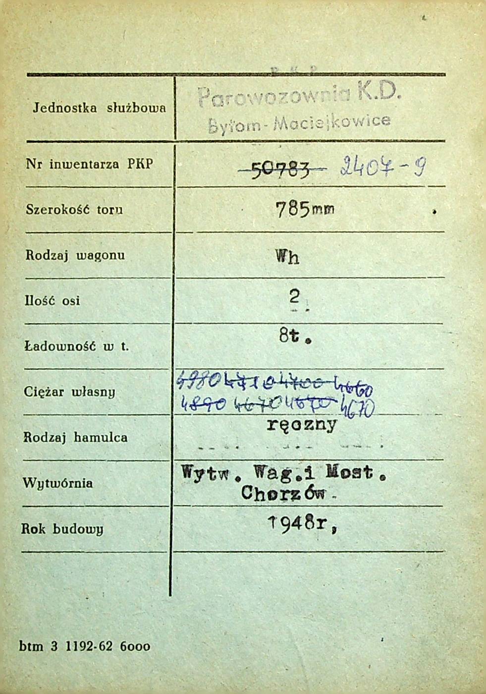 Karta wagonu Górnośląskich Kolei Wąskotorowych |