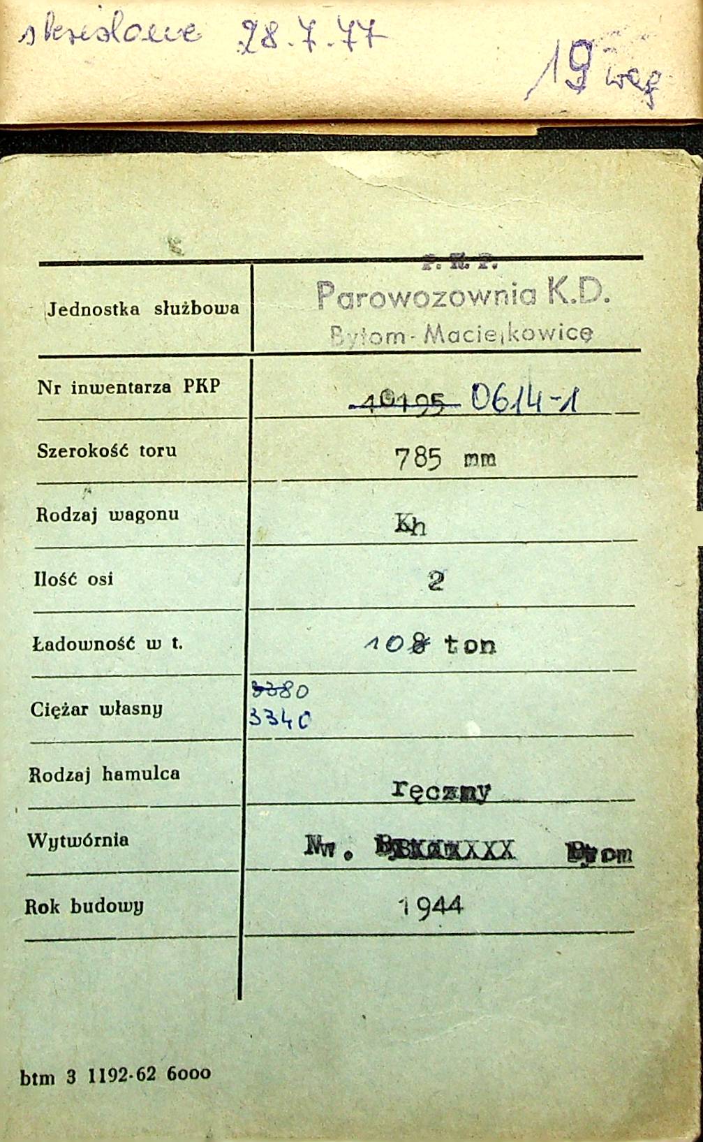 Karta wagonu Górnośląskich Kolei Wąskotorowych |