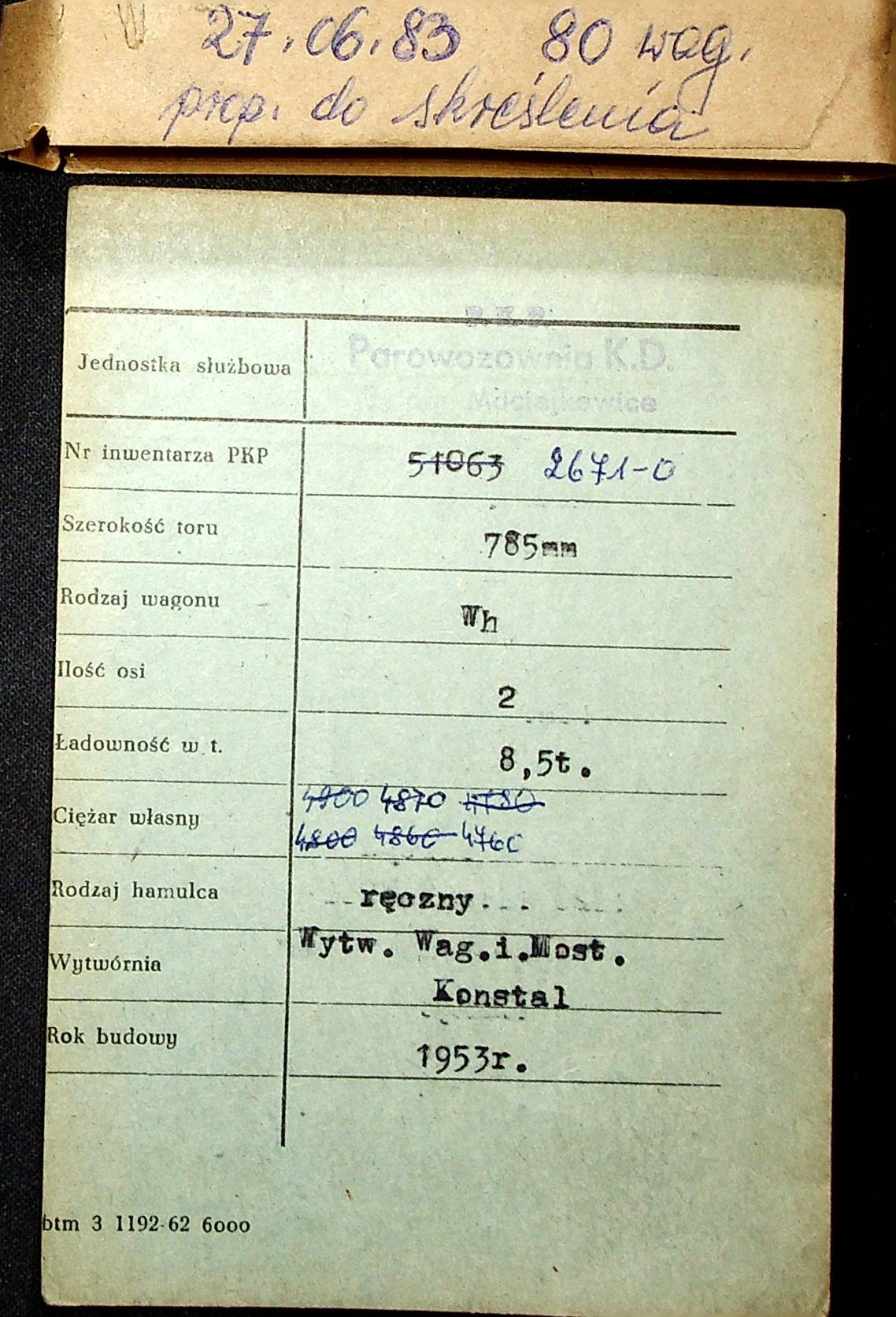 Karta wagonu Górnośląskich Kolei Wąskotorowych |