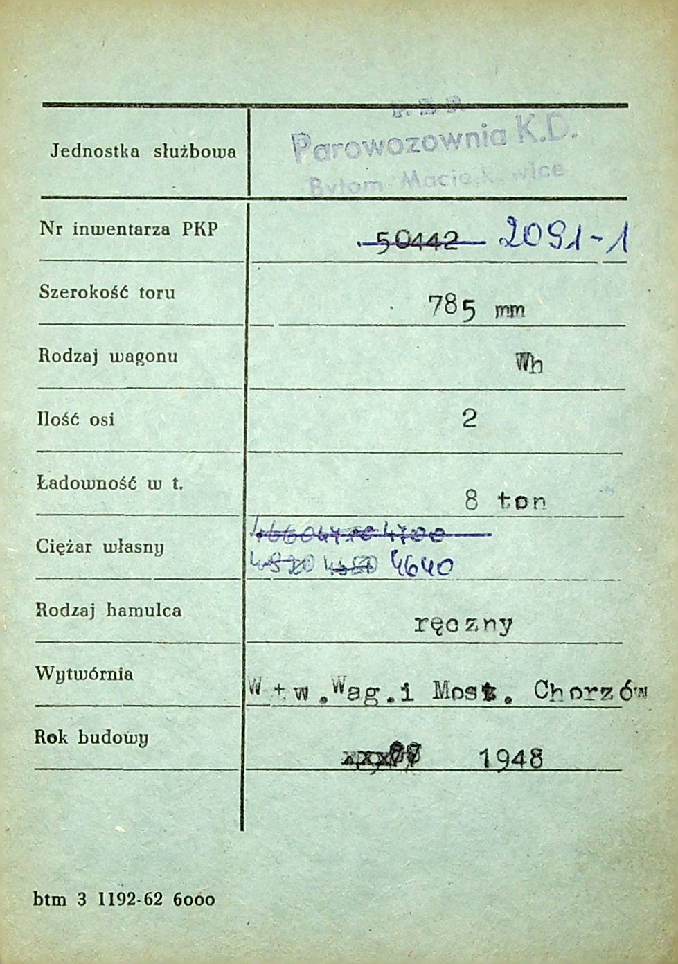 Karta wagonu Górnośląskich Kolei Wąskotorowych |