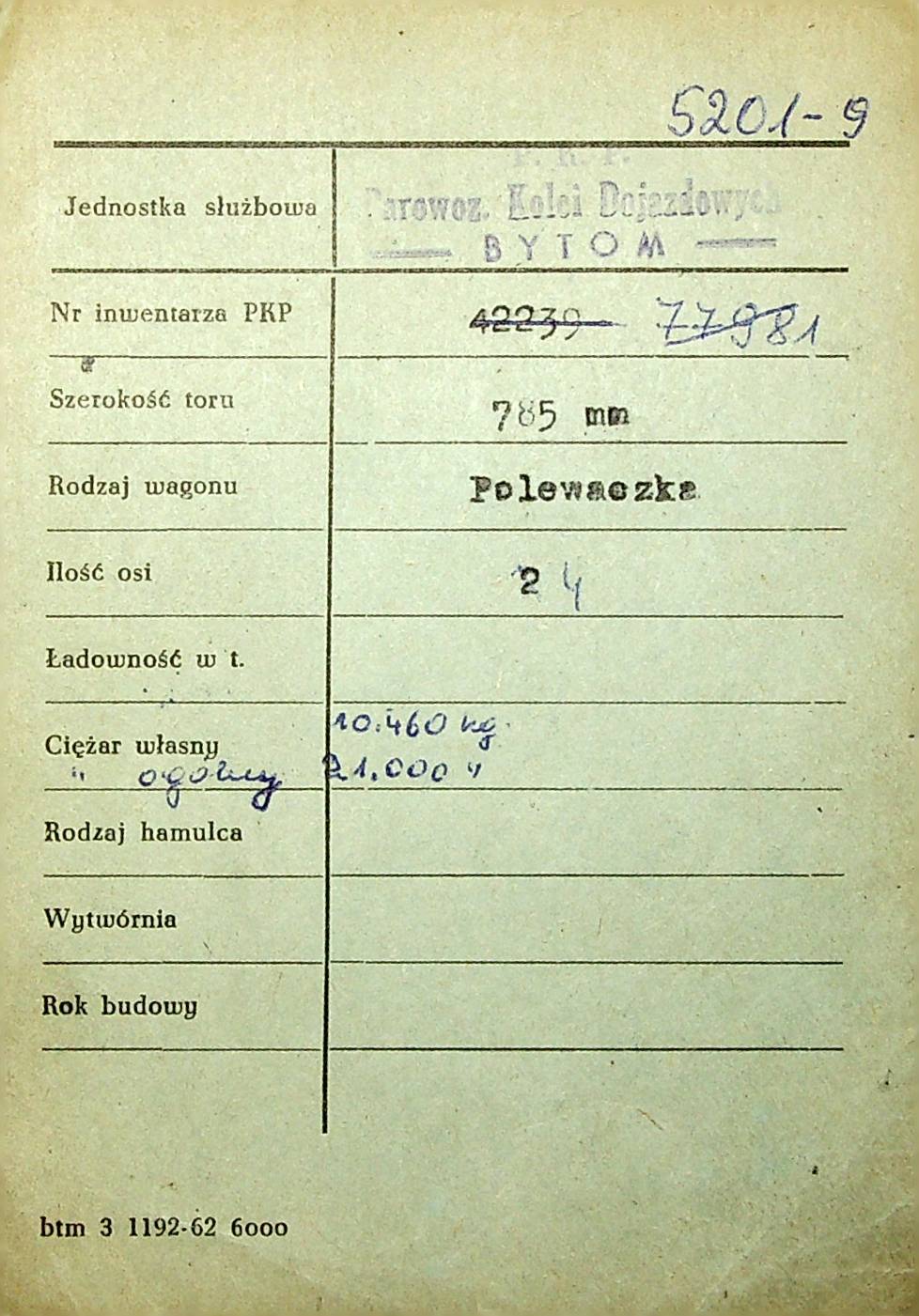 Karta wagonu Górnośląskich Kolei Wąskotorowych |