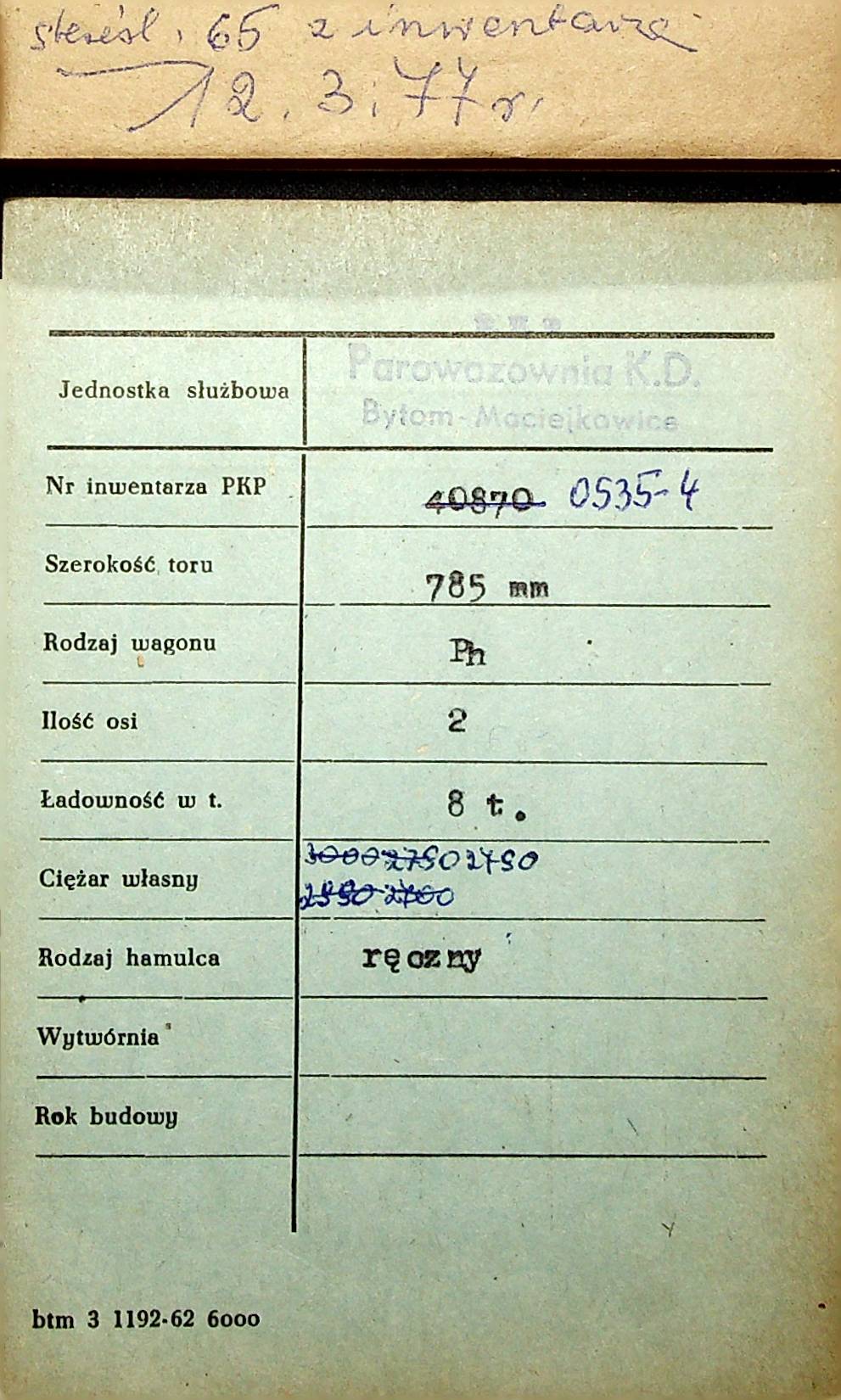 Karta wagonu Górnośląskich Kolei Wąskotorowych |