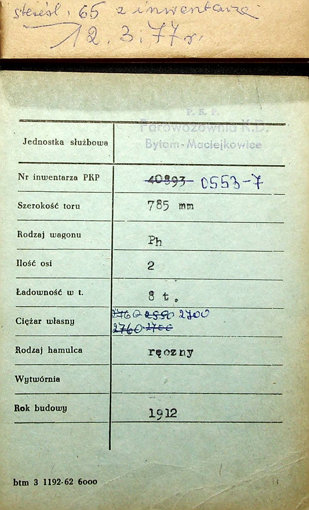 Karta wagonu Górnośląskich Kolei Wąskotorowych |