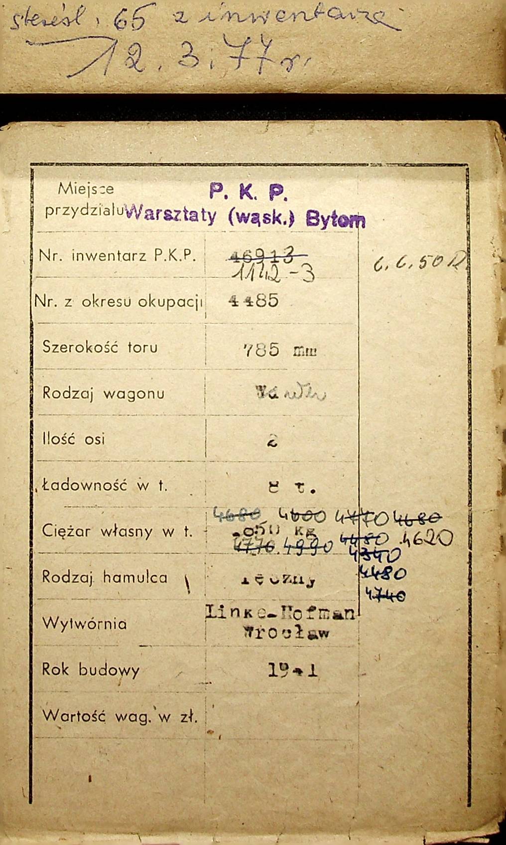 Karta wagonu Górnośląskich Kolei Wąskotorowych |