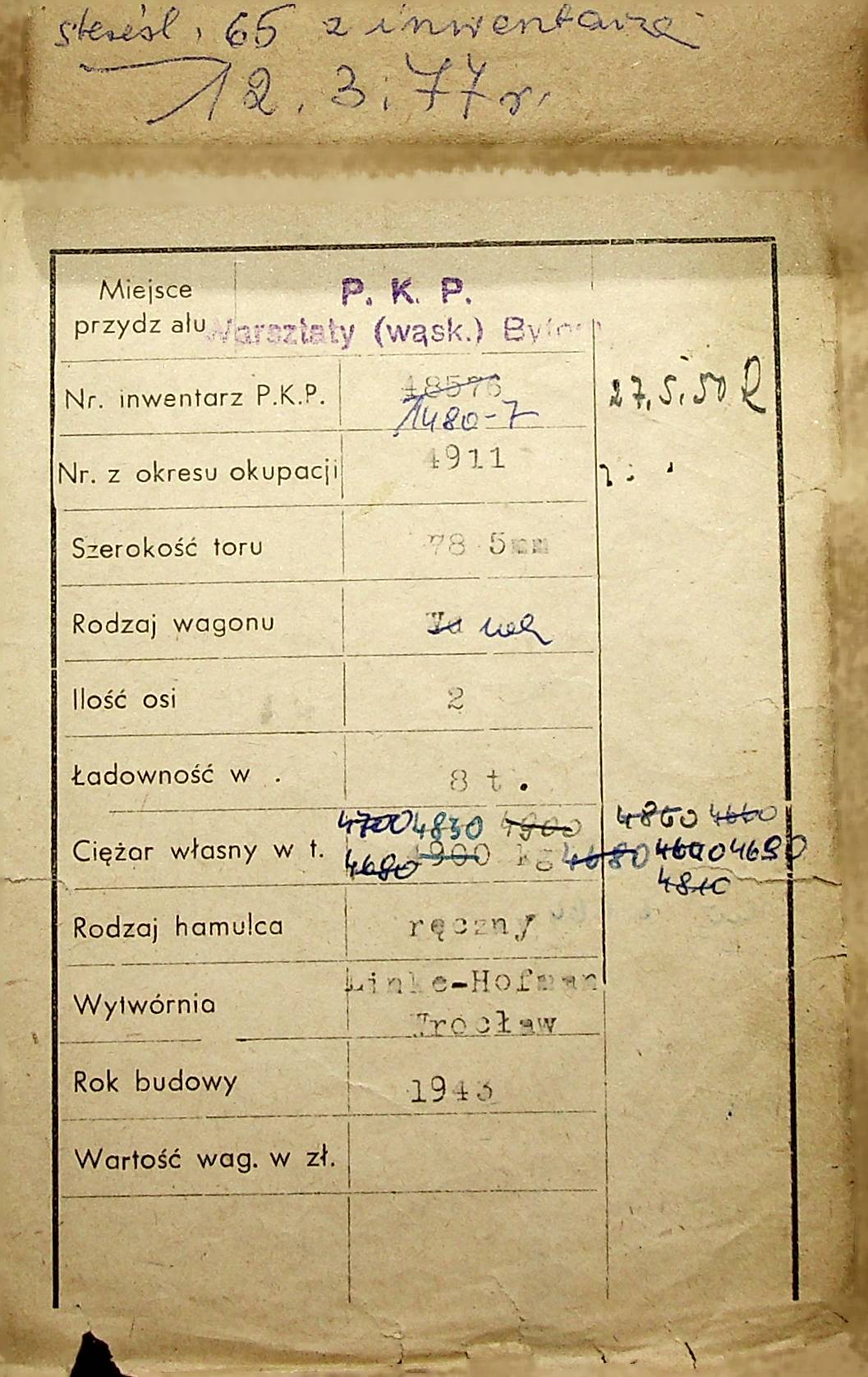 Karta wagonu Górnośląskich Kolei Wąskotorowych |