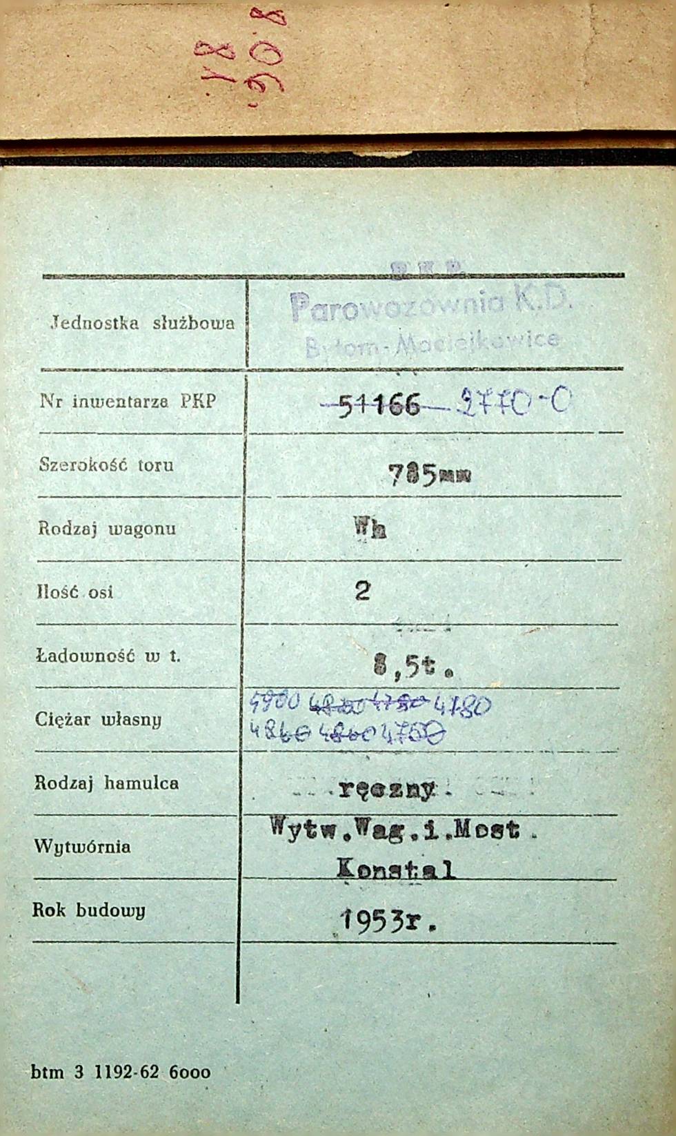 Karta wagonu Górnośląskich Kolei Wąskotorowych |