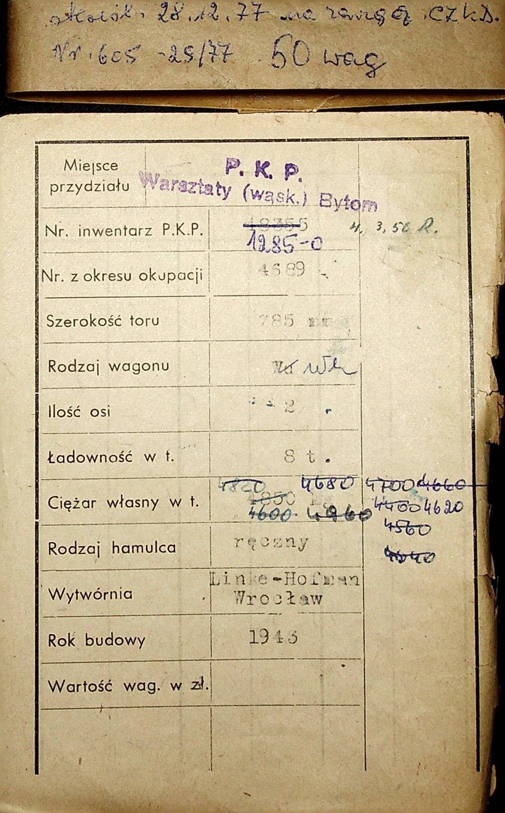 Karta wagonu Górnośląskich Kolei Wąskotorowych |