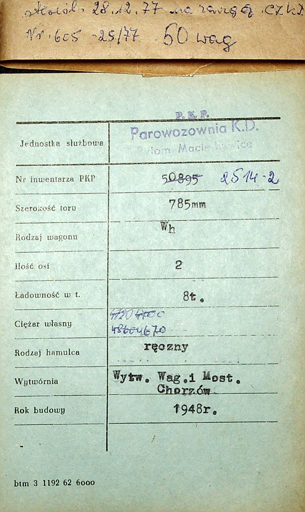 Karta wagonu Górnośląskich Kolei Wąskotorowych |