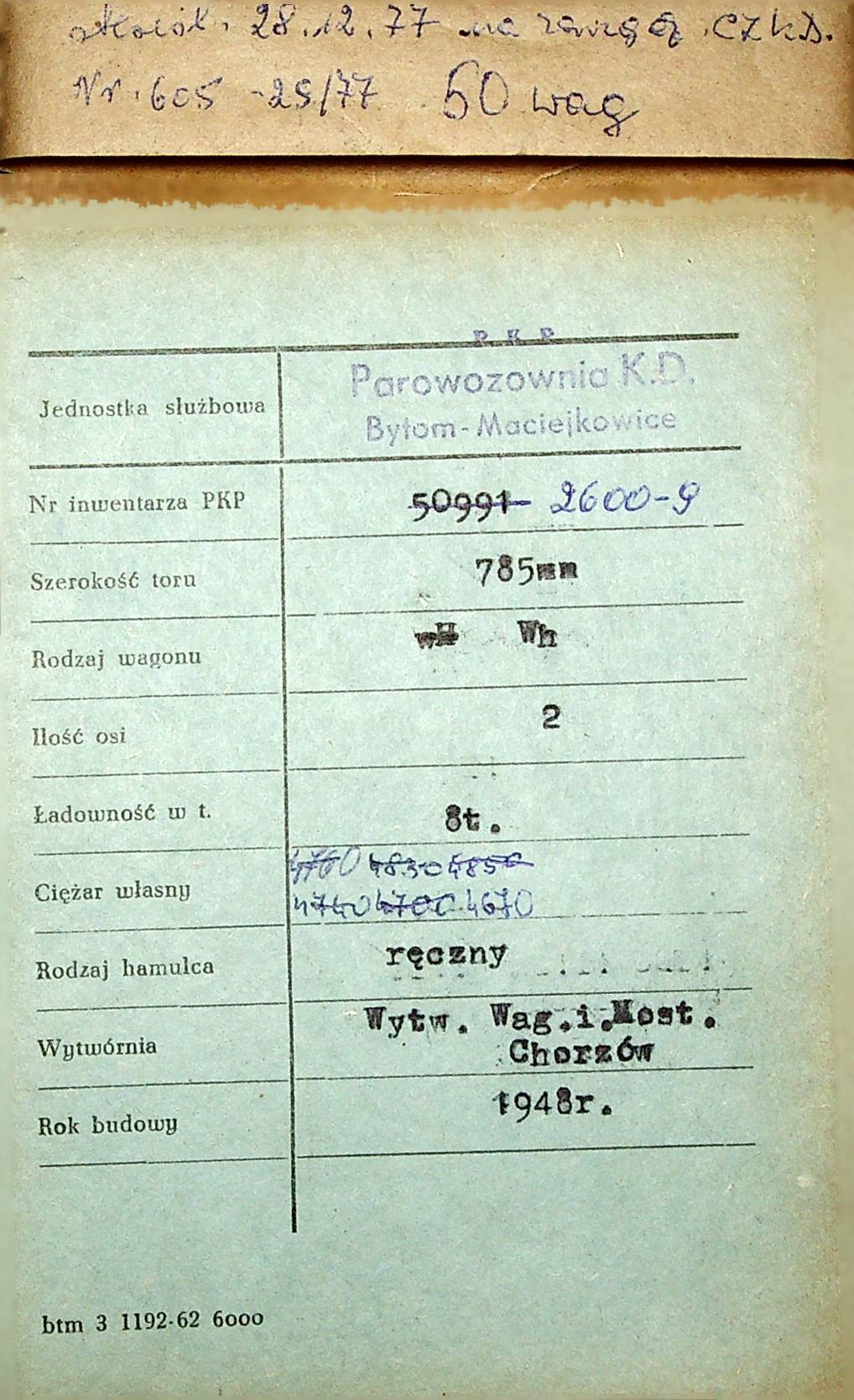 Karta wagonu Górnośląskich Kolei Wąskotorowych |