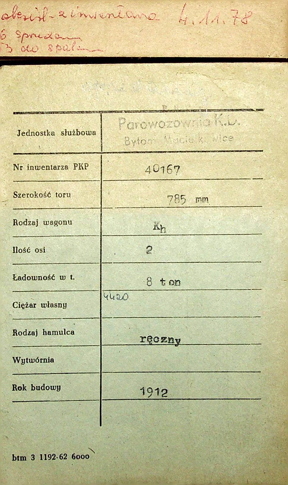 Karta wagonu Górnośląskich Kolei Wąskotorowych |