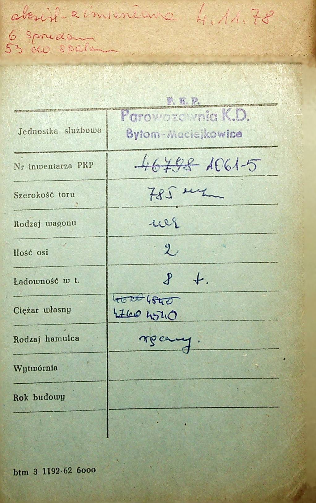 Karta wagonu Górnośląskich Kolei Wąskotorowych |