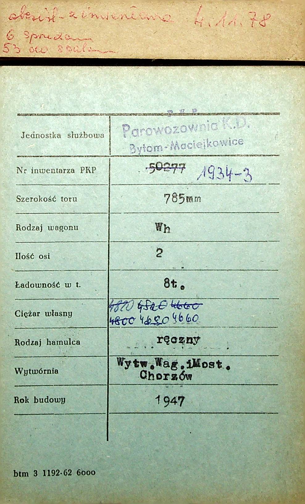 Karta wagonu Górnośląskich Kolei Wąskotorowych |