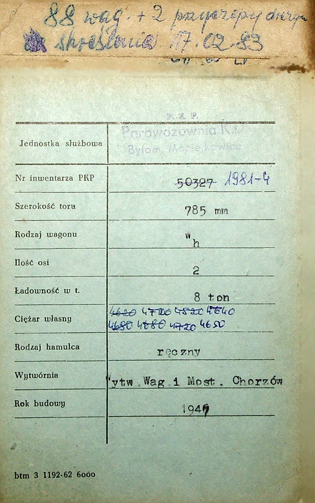 Karta wagonu Górnośląskich Kolei Wąskotorowych |