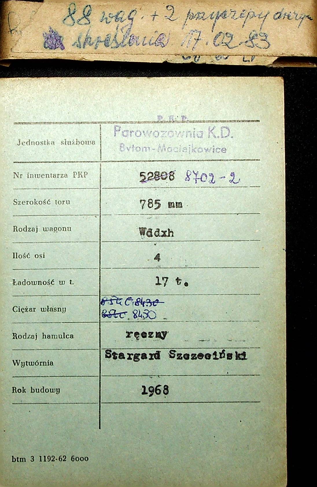 Karta wagonu Górnośląskich Kolei Wąskotorowych |