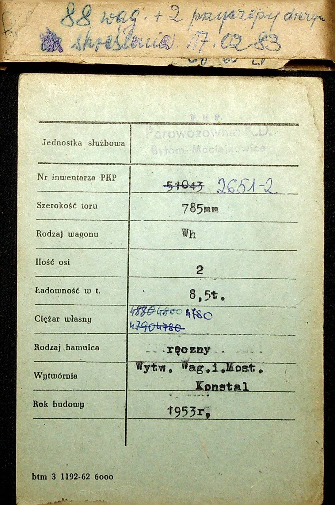 Karta wagonu Górnośląskich Kolei Wąskotorowych |