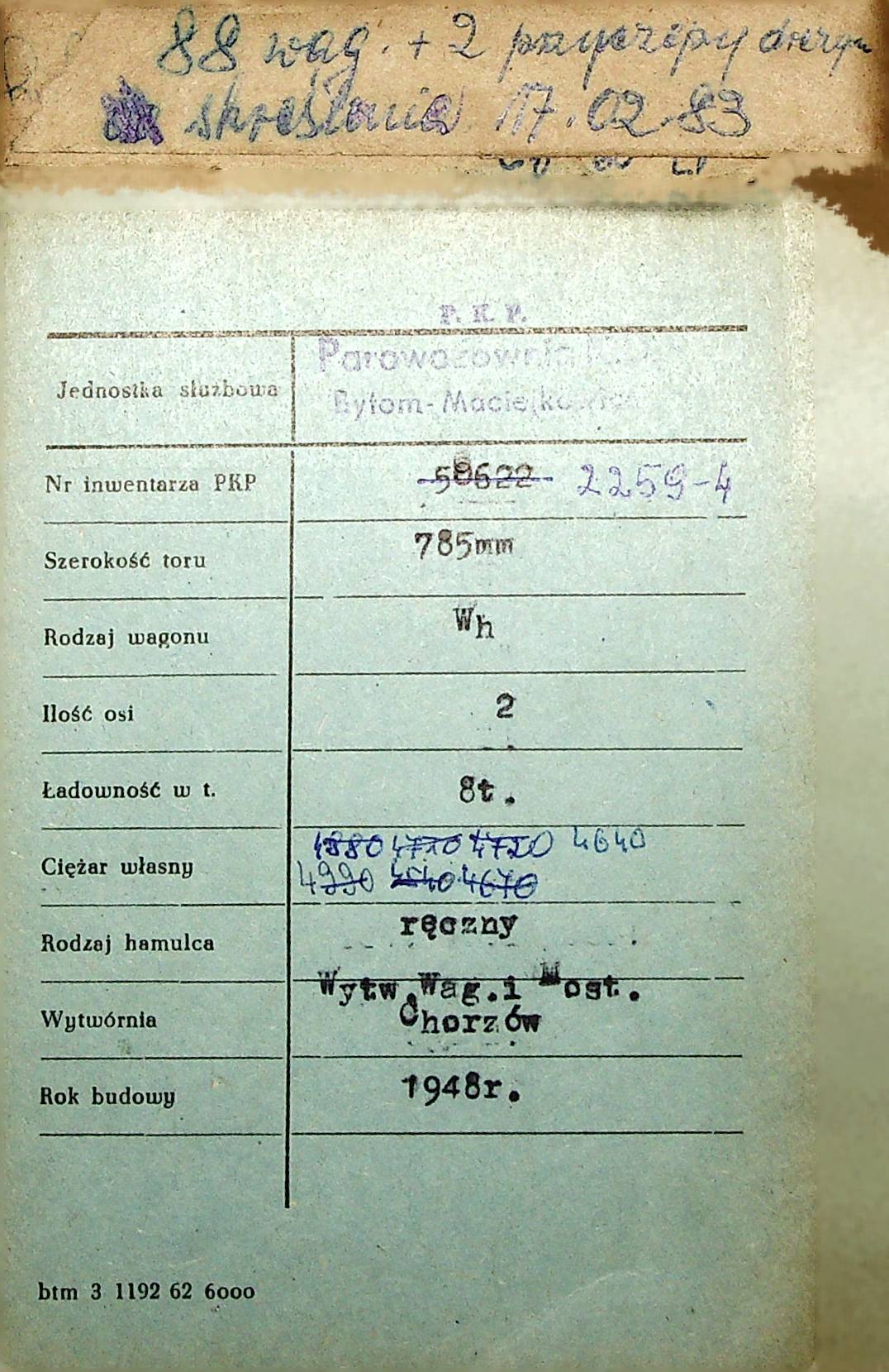Karta wagonu Górnośląskich Kolei Wąskotorowych |