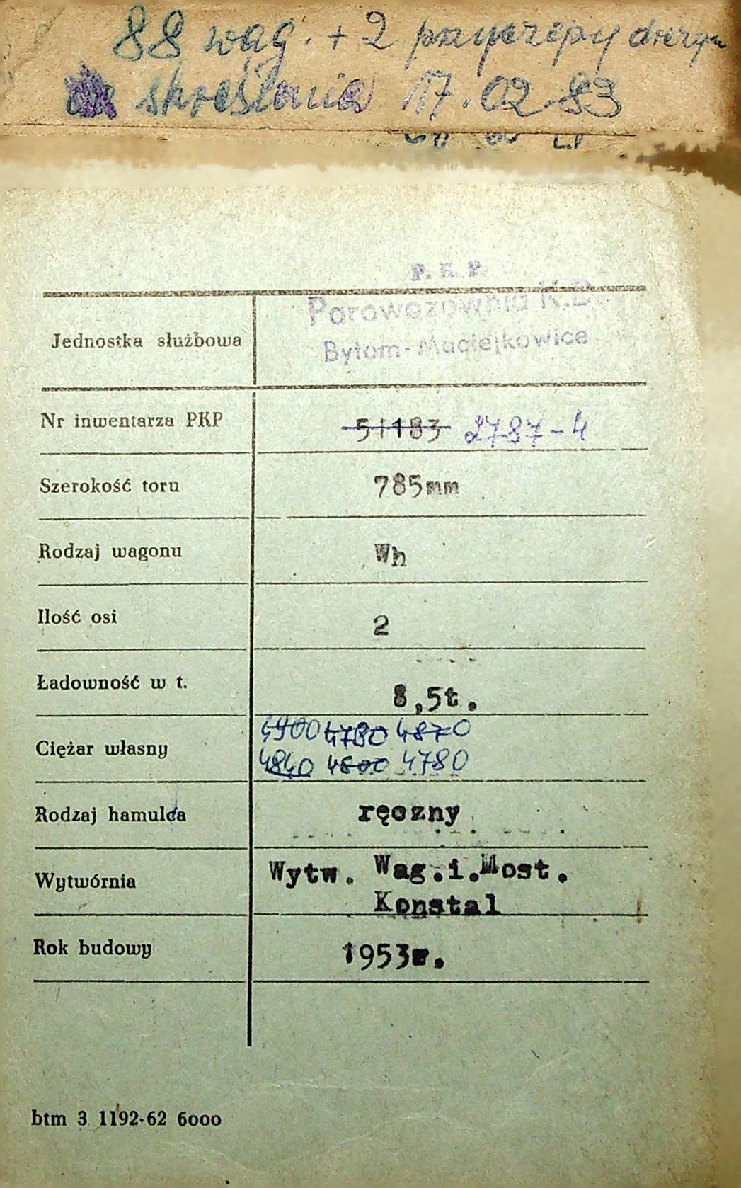 Karta wagonu Górnośląskich Kolei Wąskotorowych |