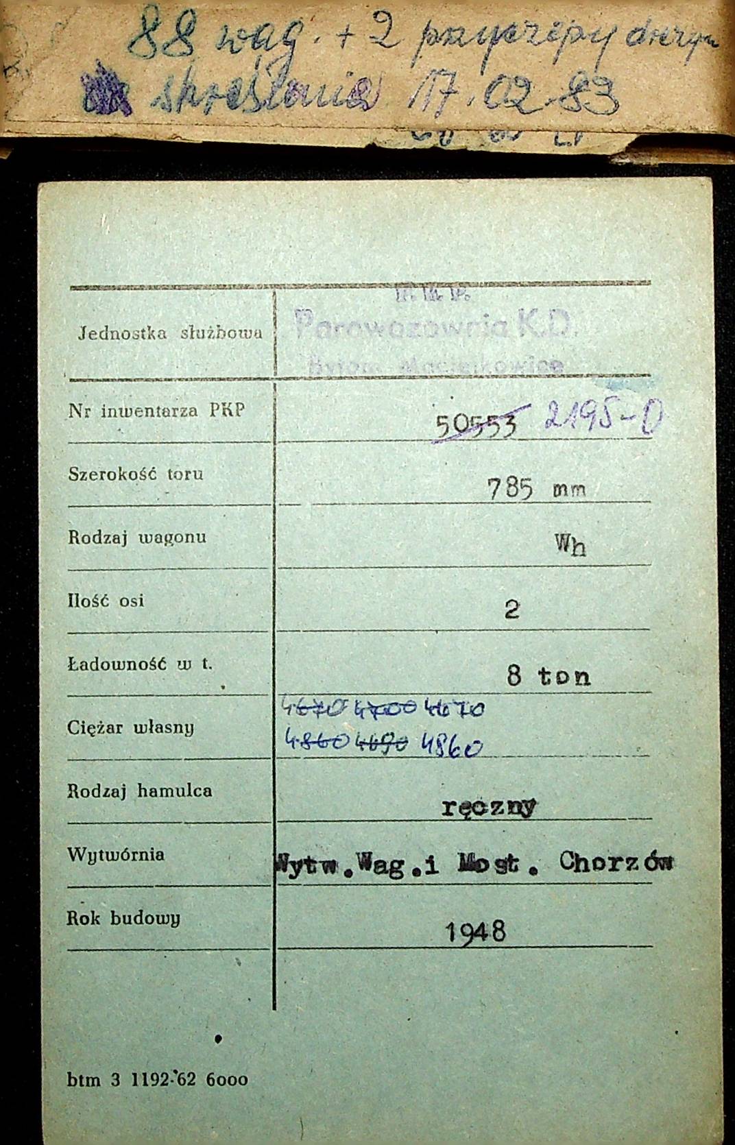 Karta wagonu Górnośląskich Kolei Wąskotorowych |