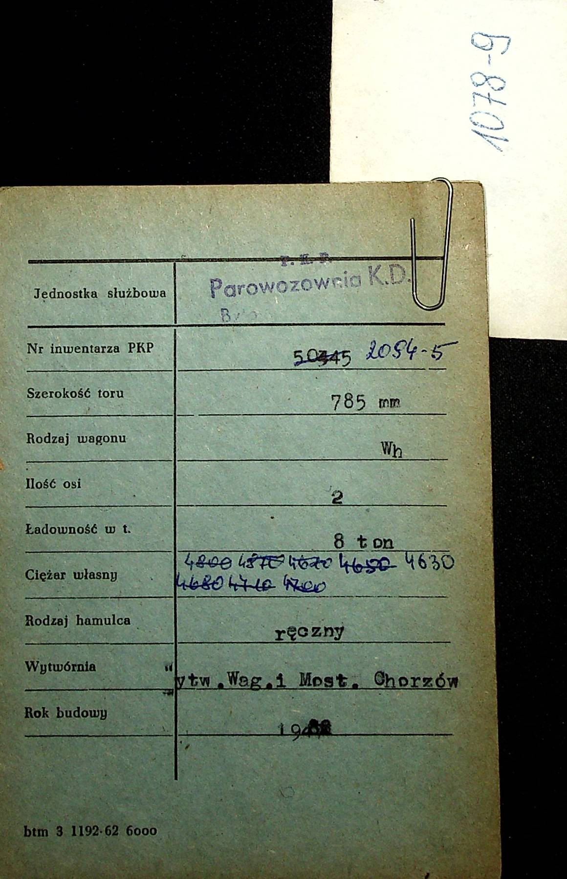Karta wagonu Górnośląskich Kolei Wąskotorowych |