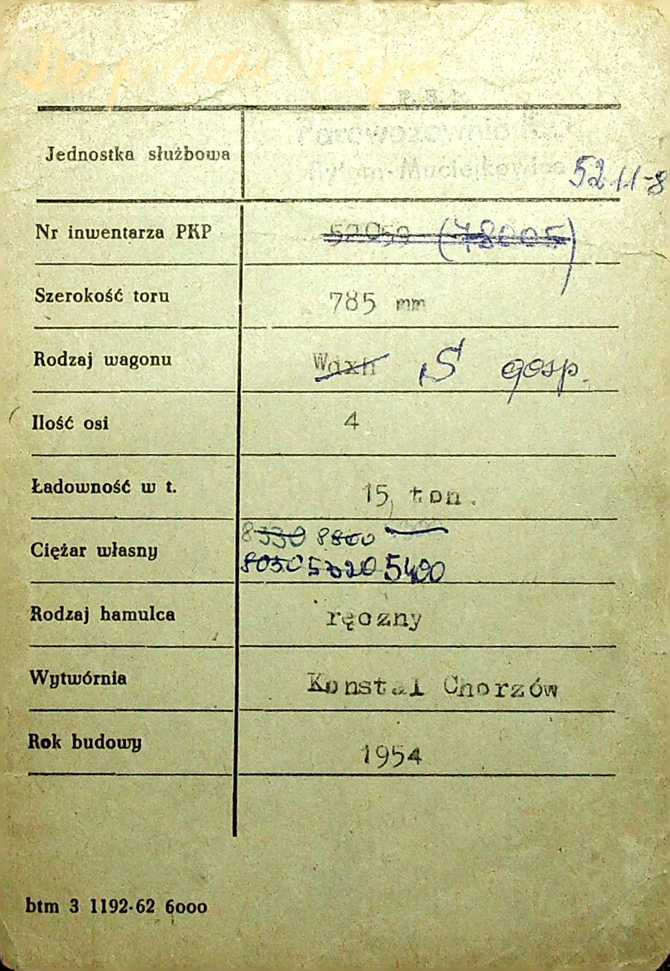 Karta wagonu Górnośląskich Kolei Wąskotorowych |