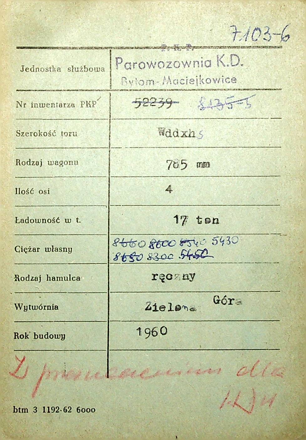 Karta wagonu Górnośląskich Kolei Wąskotorowych |