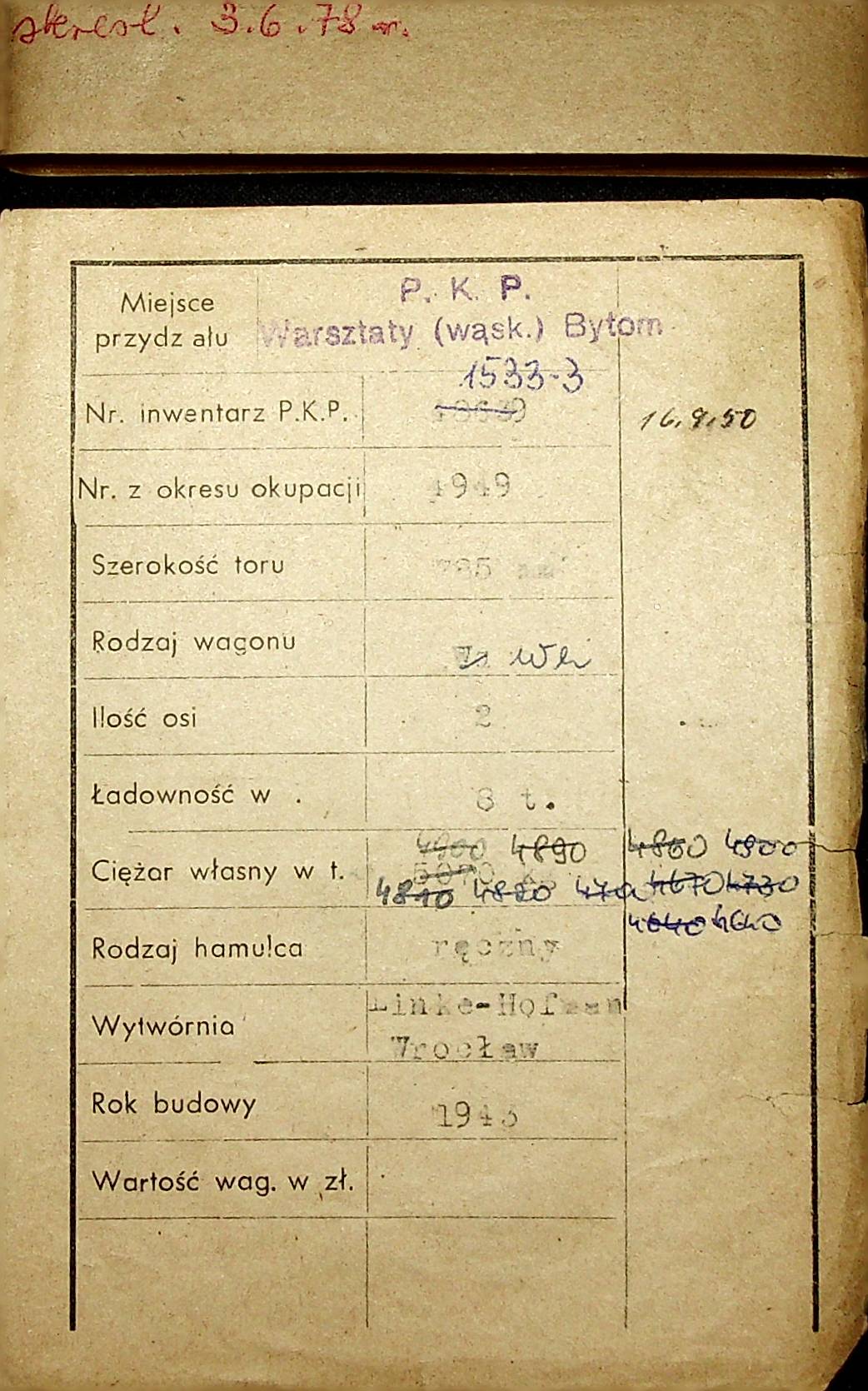 Karta wagonu Górnośląskich Kolei Wąskotorowych |