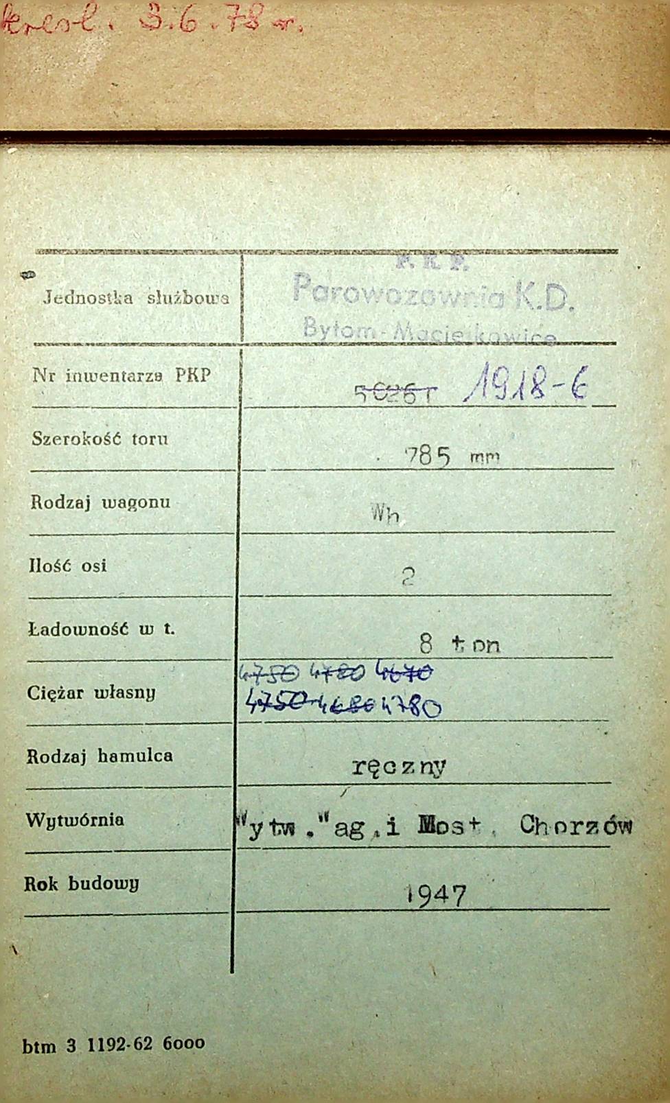 Karta wagonu Górnośląskich Kolei Wąskotorowych |