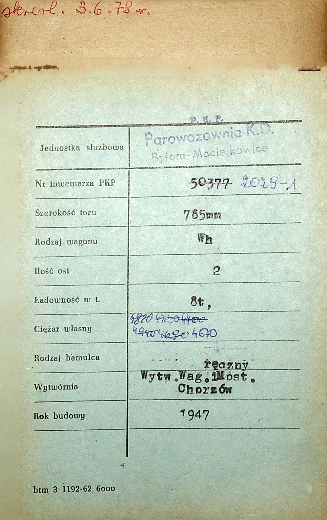 Karta wagonu Górnośląskich Kolei Wąskotorowych |