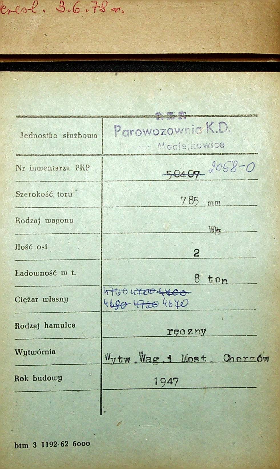 Karta wagonu Górnośląskich Kolei Wąskotorowych |