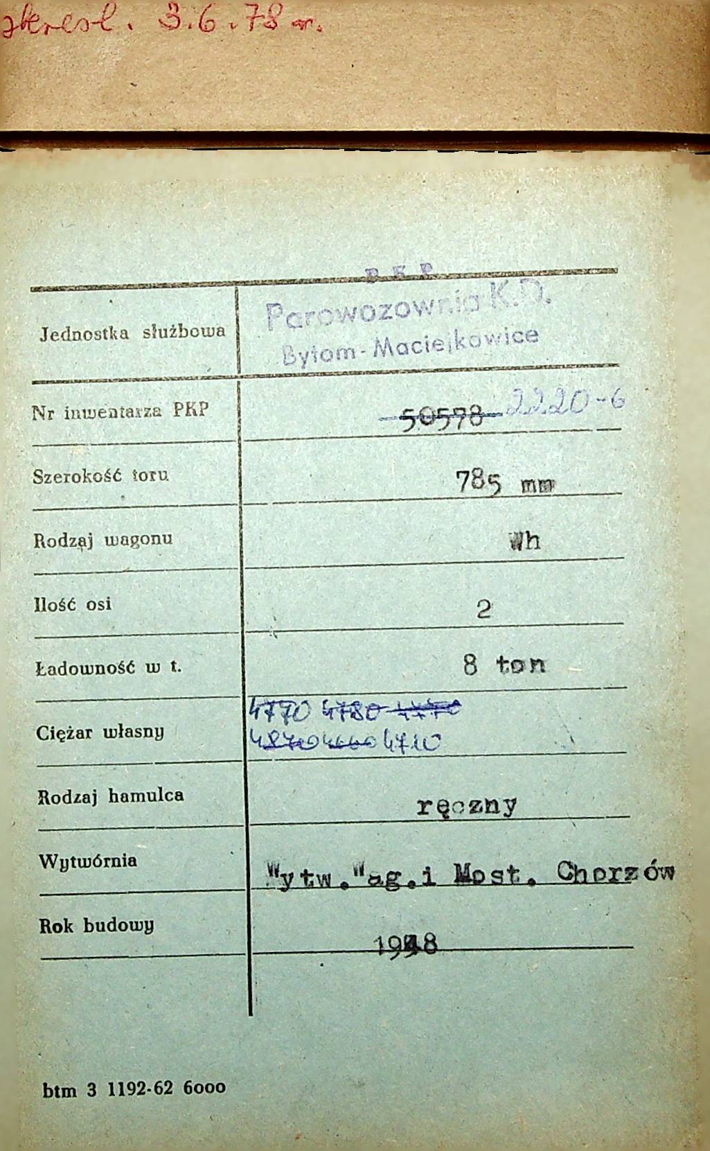 Karta wagonu Górnośląskich Kolei Wąskotorowych |