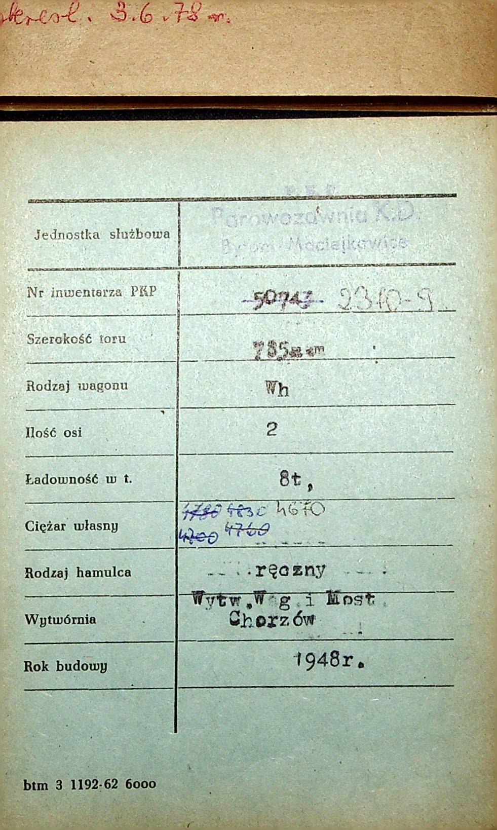 Karta wagonu Górnośląskich Kolei Wąskotorowych |