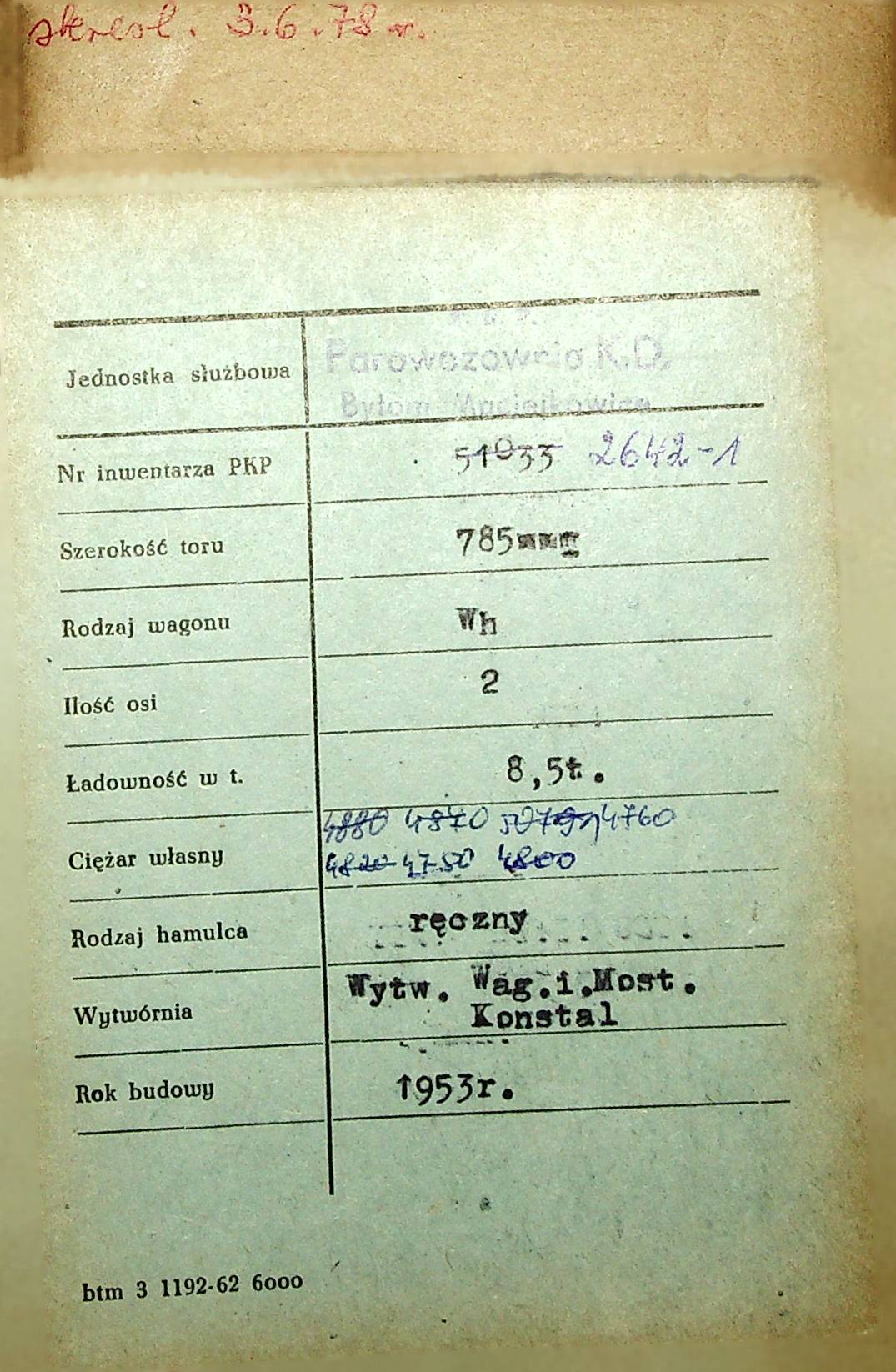 Karta wagonu Górnośląskich Kolei Wąskotorowych |