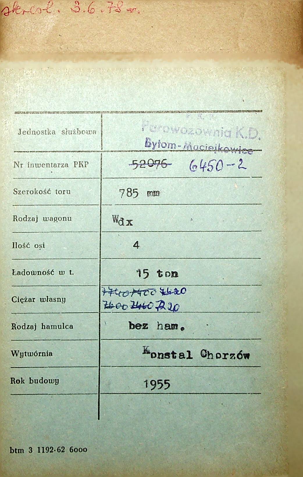 Karta wagonu Górnośląskich Kolei Wąskotorowych |