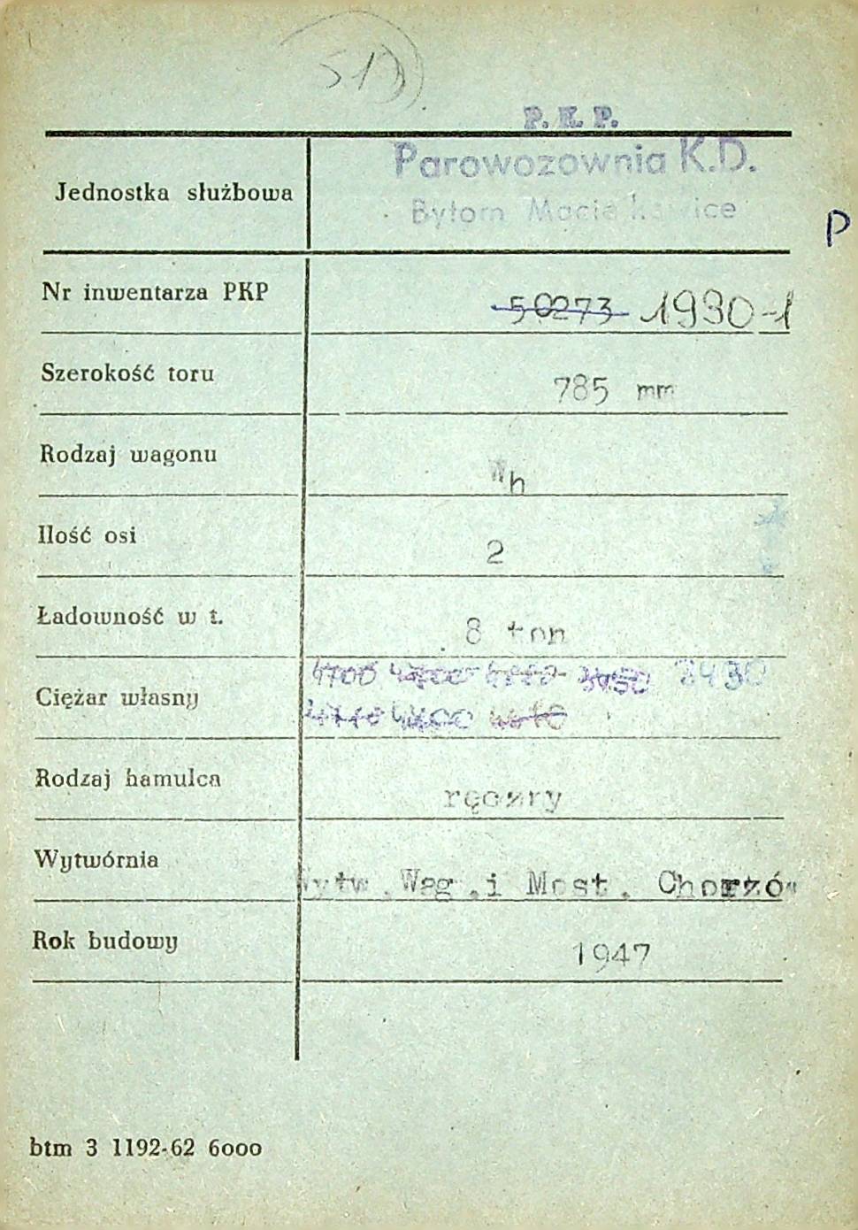 Karta wagonu Górnośląskich Kolei Wąskotorowych |
