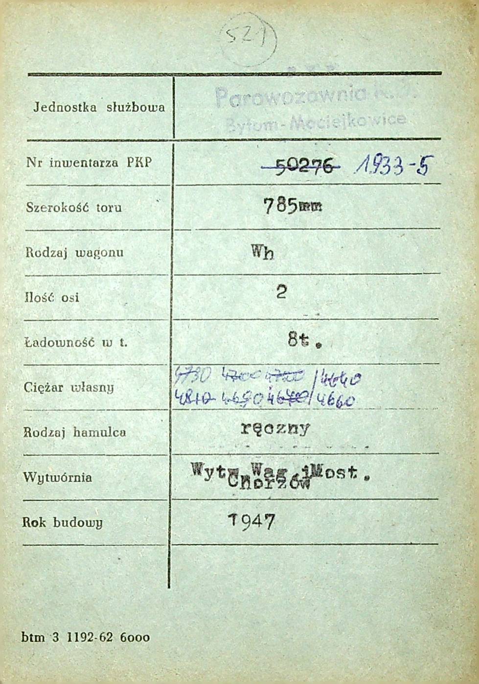 Karta wagonu Górnośląskich Kolei Wąskotorowych |