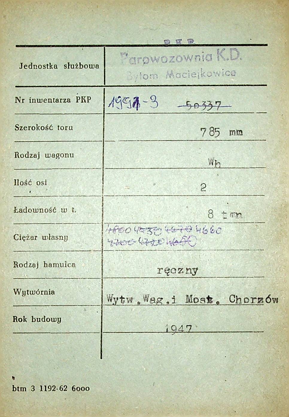 Karta wagonu Górnośląskich Kolei Wąskotorowych |