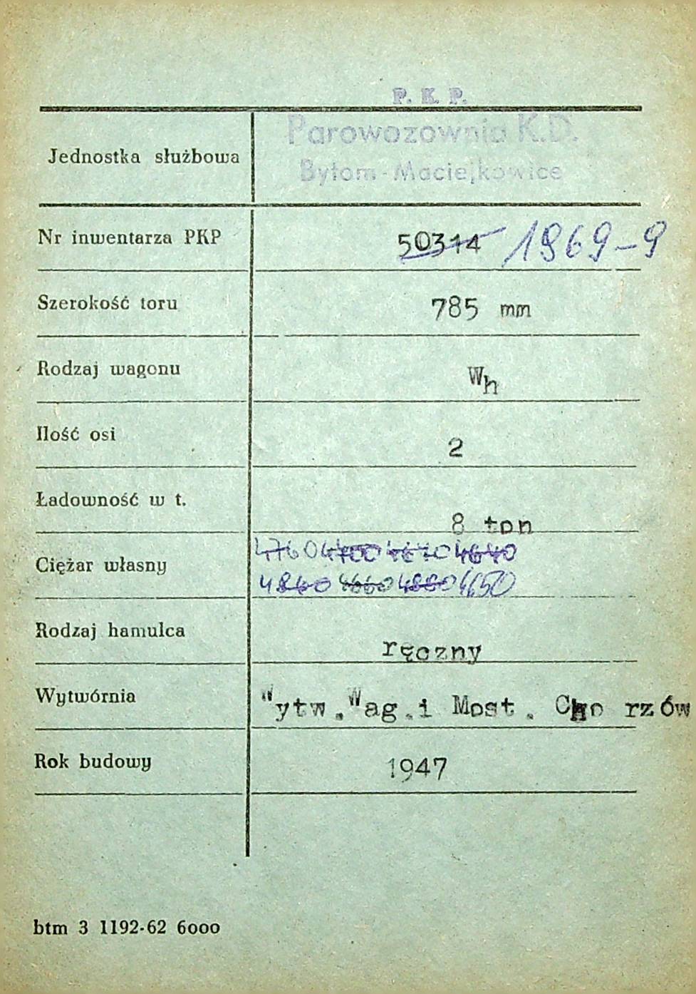 Karta wagonu Górnośląskich Kolei Wąskotorowych |