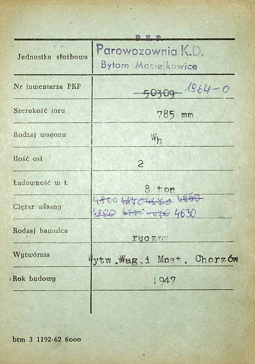 Karta wagonu Górnośląskich Kolei Wąskotorowych |