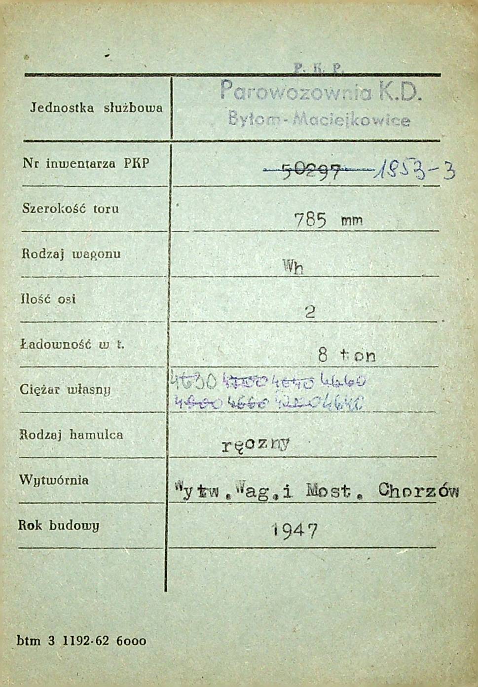 Karta wagonu Górnośląskich Kolei Wąskotorowych |