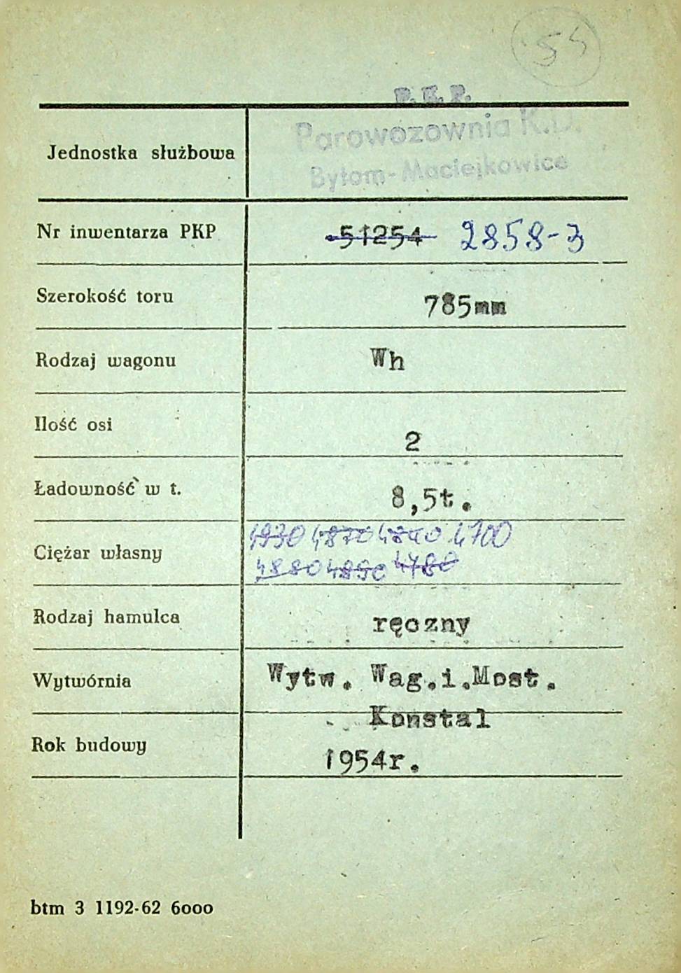 Karta wagonu Górnośląskich Kolei Wąskotorowych |