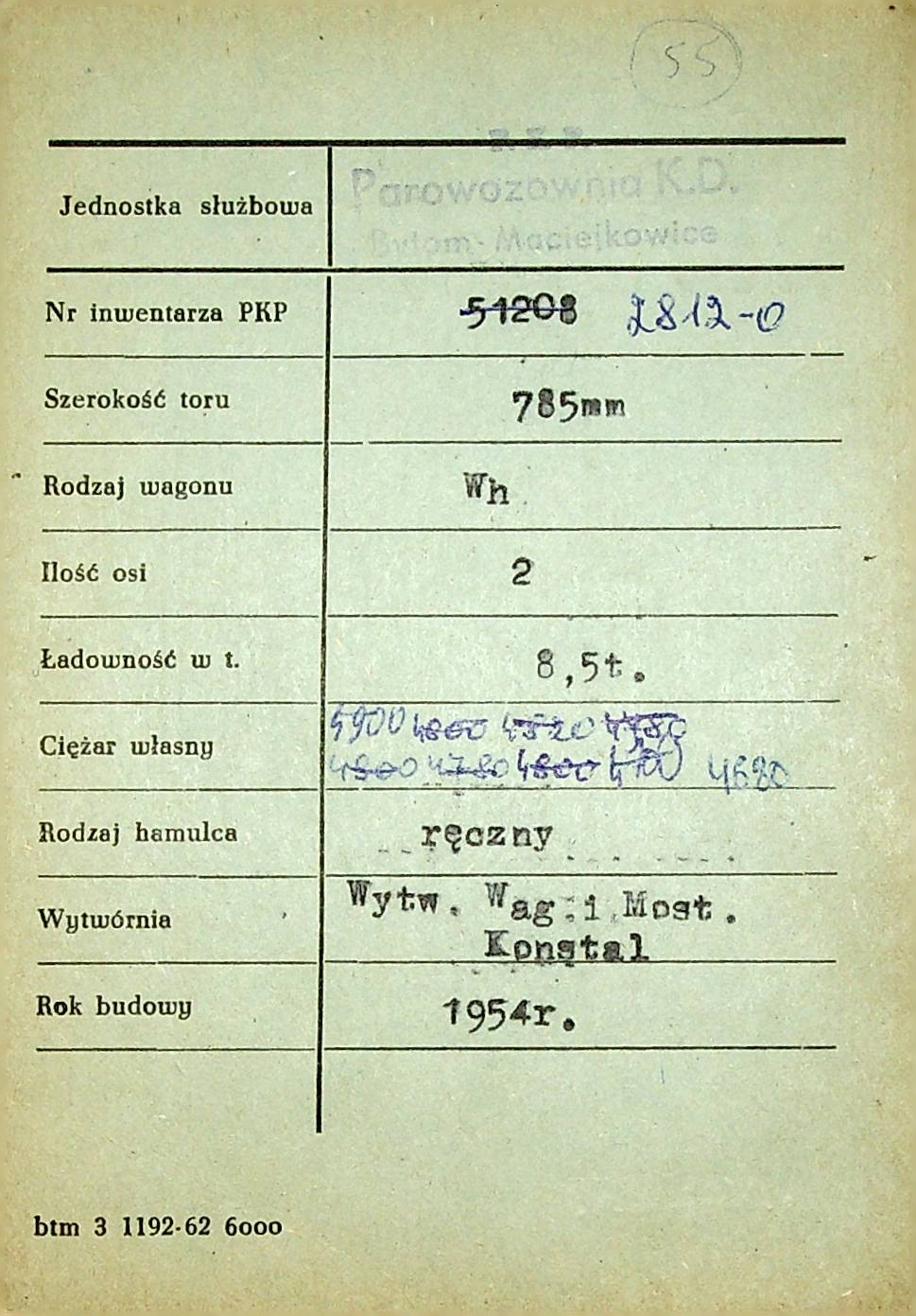 Karta wagonu Górnośląskich Kolei Wąskotorowych |