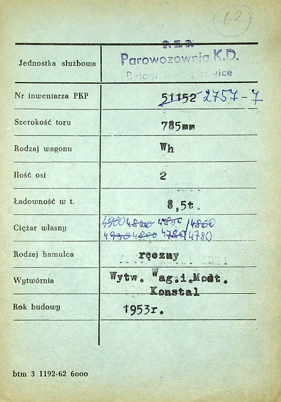 Karta wagonu Górnośląskich Kolei Wąskotorowych |