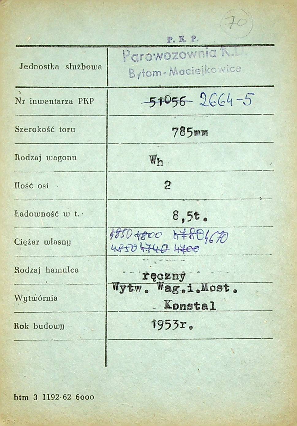 Karta wagonu Górnośląskich Kolei Wąskotorowych |